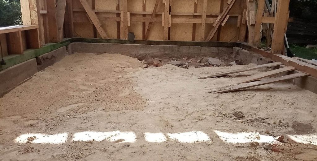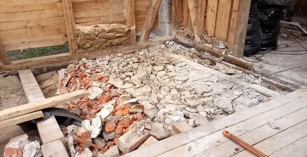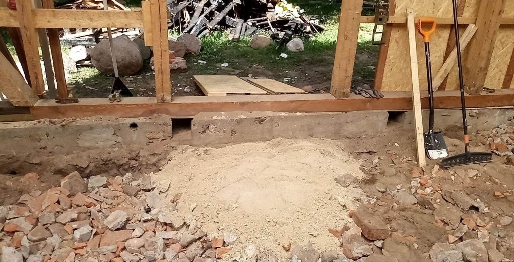 Keset köök/esikut kõrgus suur hunnik. Seal valitses täielik muldpõrand ja oli tõepoolest ruum, kuhu igatsesin miskit kindlamat ja puhastatavamat saada. Ennem vist sai siiski vana esik ja tänane magamistuba tühjaks, muuhulgas sai ära kasutatud kõik lapstööjõud ja moositud ka õelapsed kive välja vedama. Loodetavasti meenutavad nad meid tulevikus sellest hoolimata hea sõnaga. Köök kolis ajutiselt magamistuppa ja viimased tööd said tehtud juba siis, kui me ise tagasi alevis olime. Peno peale läks onult ülejääkidena saadud põrandakütte torustik ja kohale tulid betoonionud firmast ErkMar.