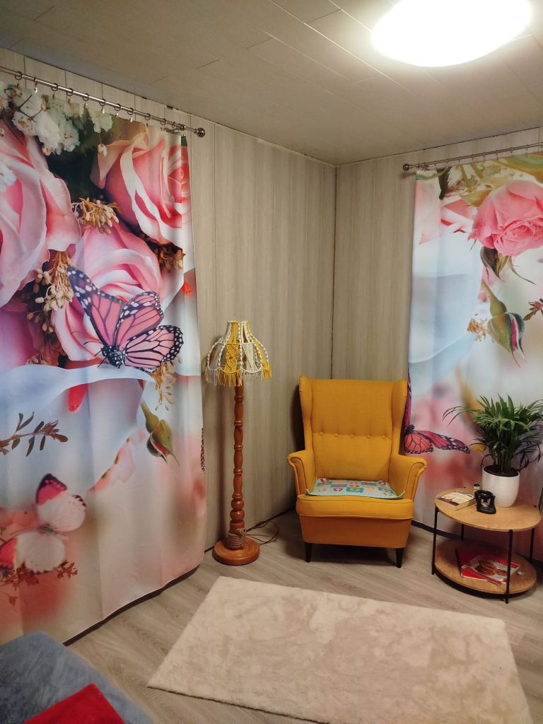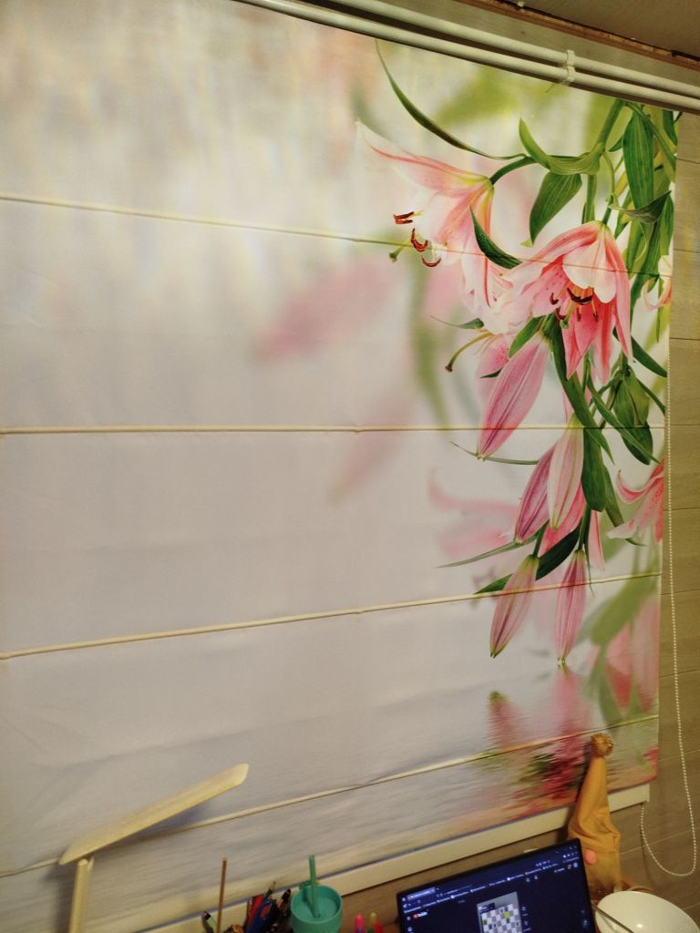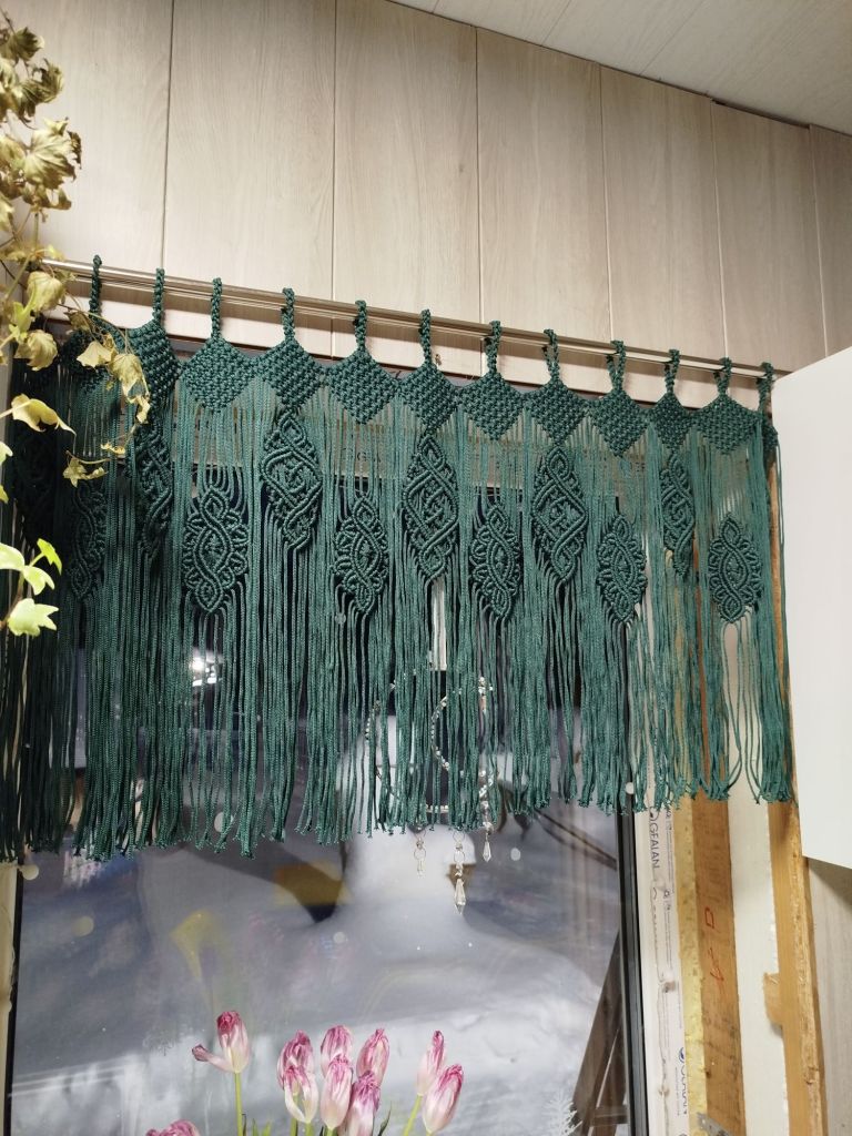 Akendel on ilusad kardinad ka ees. Fotokardinad elutoas ja magamistoas. Kunagi tellisin poolpimendavad kardinad elutuppa, kuna maja oli madal ja aken lai, siis tuli neil natuke leiutada, et pilt jääks ilus. Ma olin vaimistuses. Seekord tellisin juba eelmine talv ära akna mõõtude järgi, aga ma ei teagi, kas teha reklaami. Poolpimendavad kardinad on mugavad selle poolest, et suvel ei küta tuba kuumaks aga toas on endiselt mõnusalt valge. Telekas siiski natuke ikkagi peegeldab. Trükikvaliteedi osas ei ole rahul, esimesed kardinad olid selgema pildiga. Ilusad on ikkagi. Pisipoja tuppa sai roomakardin/ruloo, mis algselt oli kööki plaanitud küll, aga töö käigus mõtlesin ringi. Sest kööki tegin ma kardinad ise. Tellisin hunniku makrameenööri ja asusin enesekindlalt leitud mustrit punuma. Koos kassiga.