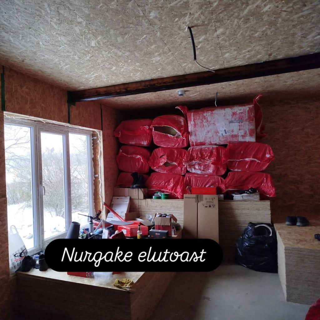 Elutuba oli aasta tagasi silmini täis osb plaate ja kivivillakotte. Oi, poisid kirusid neid plaate tuppa tassides ja veel rohkem, kui osa neist jälle välja vedada tuli. Täna on diivani taha veel esiku seinapaneelid ja nurgaliistud peidus. Ja minu laada klapp-laud ka hetkel, sest ma pole talle head kohta leidnud.